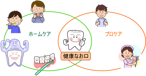 | お口を健康に保つには、ご家庭でのホームケアと歯科医院で行うプロケアの両方が必要です。 |