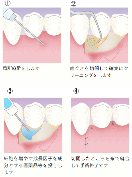 また、特殊な材料を用いて部分的に失われた骨を再生させる手術(再生療法)を行う場合もあります。手術はそれぞれの病態にあった方法が適応されます。 |